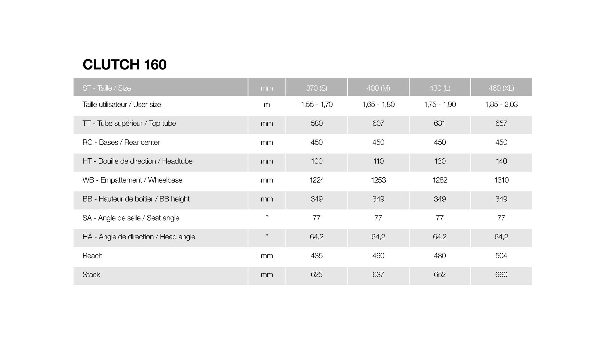 Sur chaque page produit, dans la section “géométrie”, vous trouverez les tailles recommandées par Moustache pour le modèle spécifique. Ces informations vous aident à prendre une décision éclairée en fonction de votre morphologie et de vos préférences de conduite.