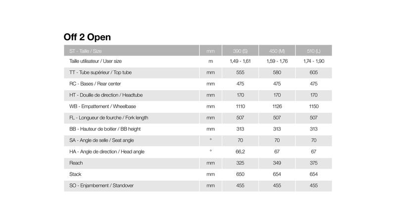Off 2 low step-over, 6061 T4-T6 alloy, triple cavity hydroformed and extruded tubes of variable thickness for optimal stiffness, Exclusive integration for the Bosch PowerTube (vertical) battery, internal cable routing